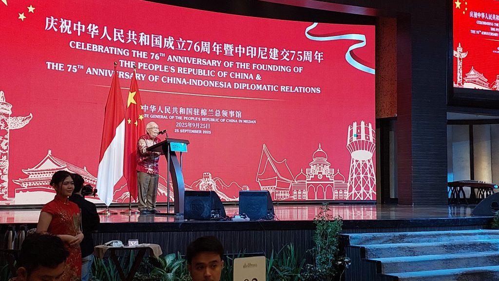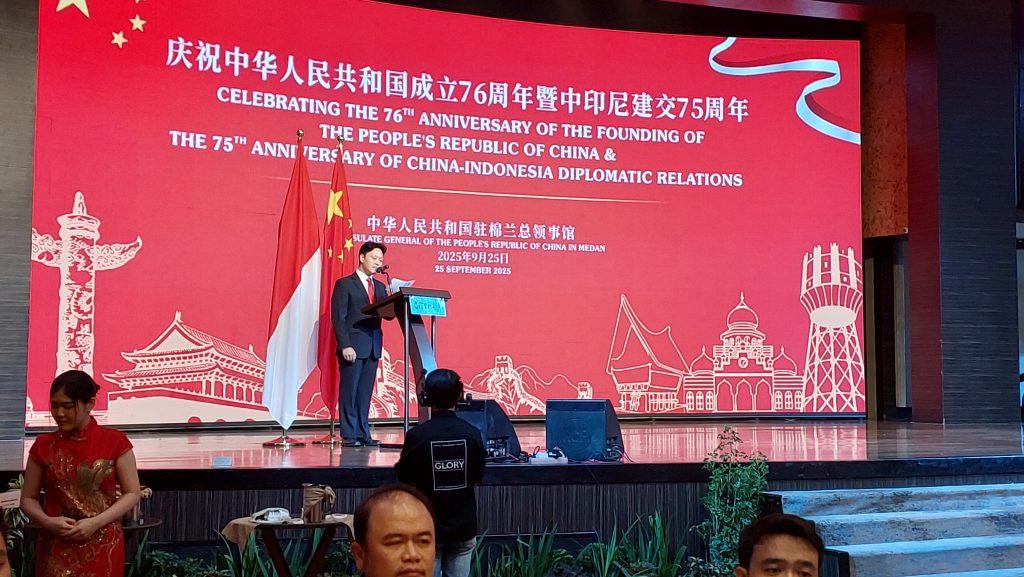 PosRoha.com |Medan, Konsulat Jenderal Republik Rakyat Tiongkok di Medan menggelar resepsi peringatan hari jadi 76 tahun berdirinya Republik Rakyat Tiongkok dan peringatan 75 tahun terjalinya hubungan diplomatik Tiongkok-Indonesia di Grand City Hall, Kamis (25/9/2025).