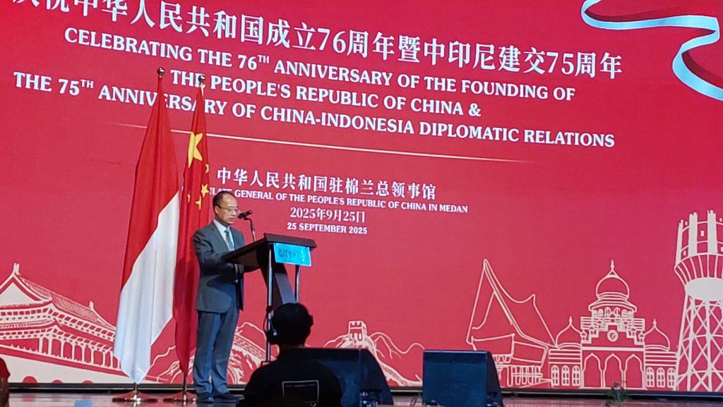 PosRoha.com |Medan, Konsulat Jenderal Republik Rakyat Tiongkok di Medan menggelar resepsi peringatan hari jadi 76 tahun berdirinya Republik Rakyat Tiongkok dan peringatan 75 tahun terjalinya hubungan diplomatik Tiongkok-Indonesia di Grand City Hall, Kamis (25/9/2025).