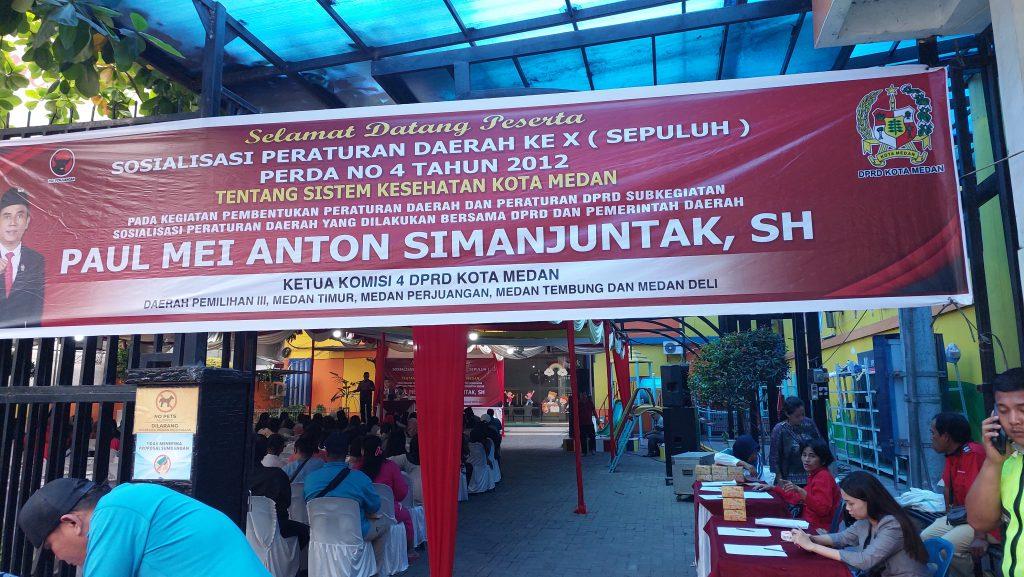 Hadir saat sosper, mewakili Kecamatan Medan Tinur Lexon Manalu SH, mewakili BPJS Kesehatan Daffa Ulhaq, Kepala Puskesmas Glugur Darat dr Sri Wirya Ningsi, tokoh masuyarakat, tokoh agama dan ratusan masyarakat. (lamru)