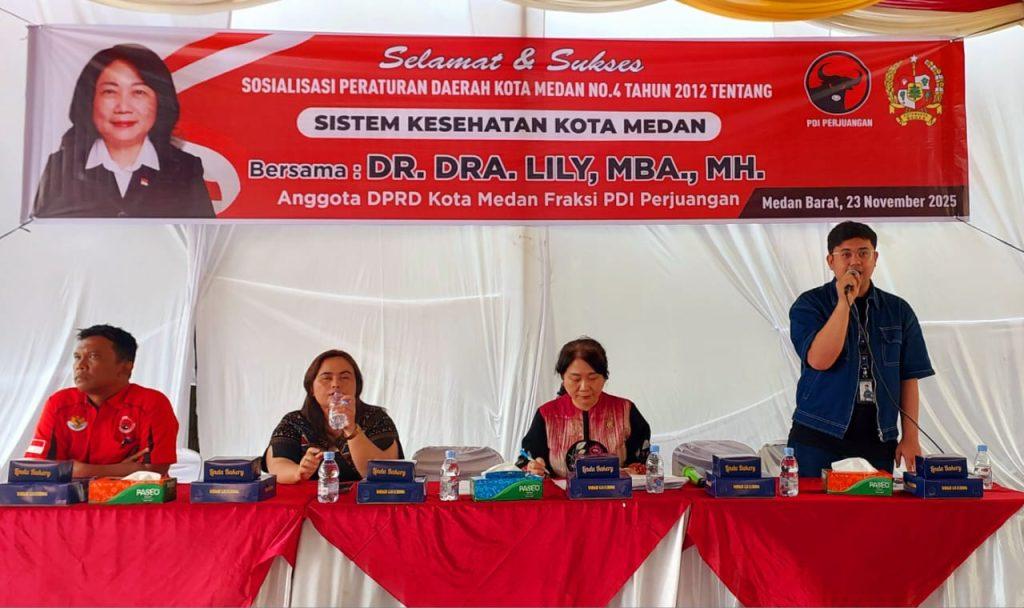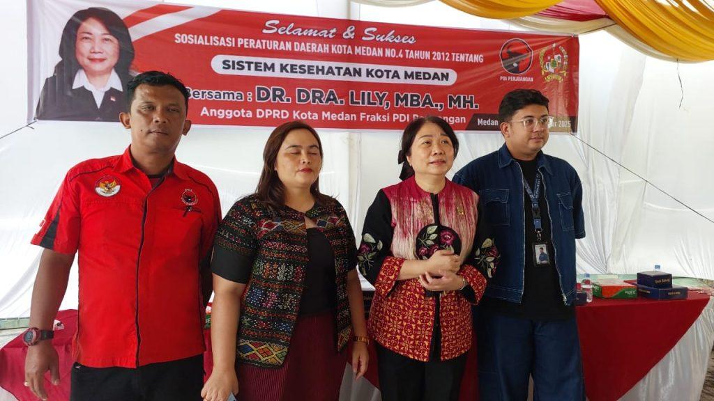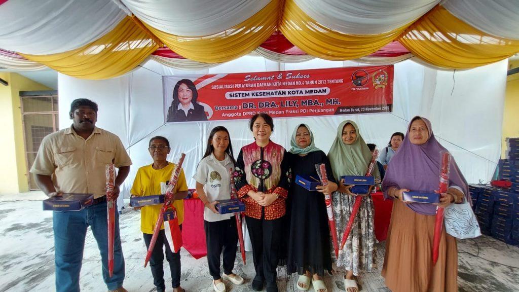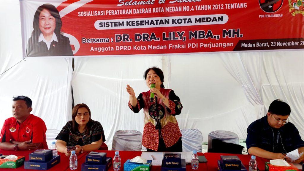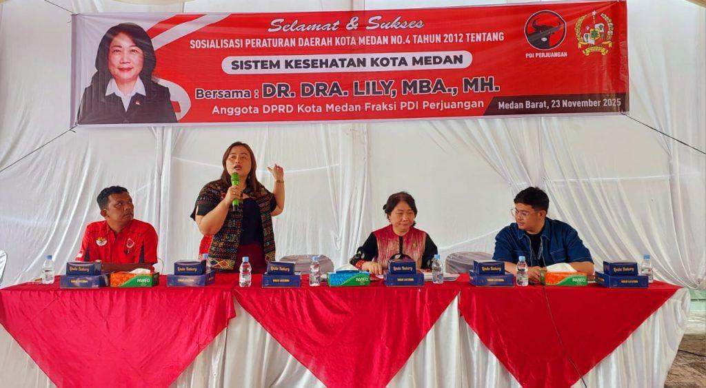 Saat pelaksanaan Sosper ke XI Tahun 2025 produk hukum Pemko Medan Perda No 4 Tahun 2012 tentang Sistem Kesehatan Kota Medan di Jl Karya Gg Mesjid lingkungan VIII, Kelurahan Sei Agul, Kecamatan Medan Barat, Minggu (23/11/2025) pagi. Anggota DPRD Medan DR Dra Lily MBA MH (PDI Perjuangan) memberikan penjelasan terkait program Universal Health Coverage (UHC).