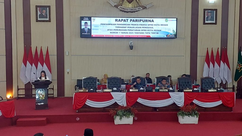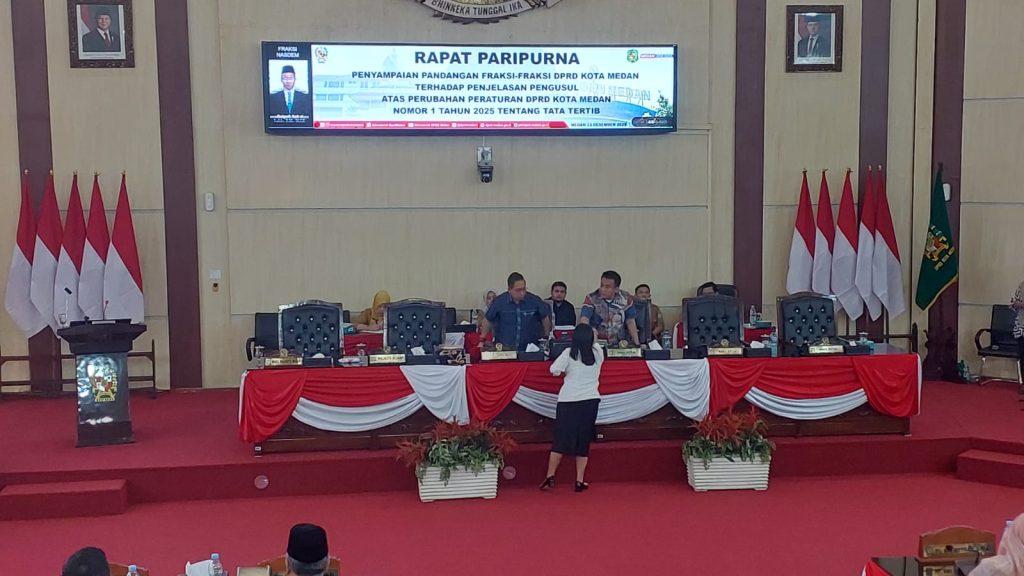 PosRoha.com | Medan, DPRD Medan gelar rapat paripurna internal pandangan Fraksi Fraksi DPRD Kota Medan terhadap penjelasan pengusul atas perubahan Perda Kota Medan No 1 Tahun 2025 tentang Tata Tata Tertib (Tertib) di ruang paripurna gedung DPRD Medan, Selasa (23/12/2025). Pandangan fraksi ini berkaitan persetujuan revisi Tatib terkait pelaksanaan kegiatan sosialisasi Wawasan kebangsaan (Wesbang).