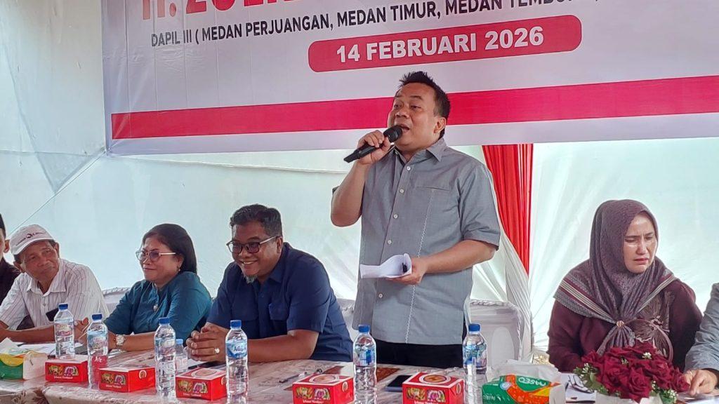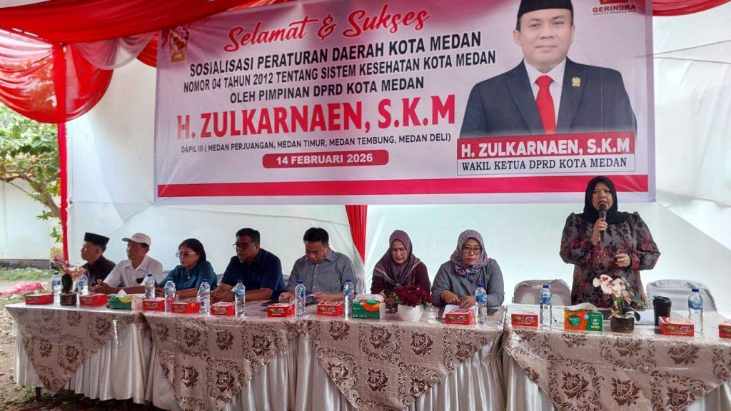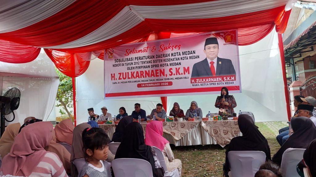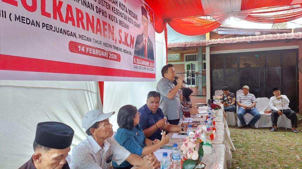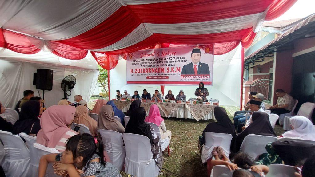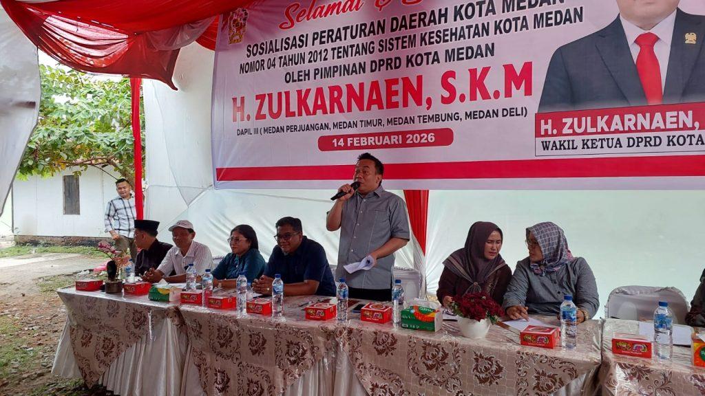 ketika pelaksanaan Sosialisasi Perda (Sosper) ke II Tahun 2026 produk hukum Pemko Medan Perda No 4 Tahun 2012 tentang Sistem Kesehatan Kota Medan di Jl Baru (lapangan badminton perisai) Kelurahan Indra Kasih, Kecamatan Medan Tembung, Sabtu (14/2/2026) pagi.