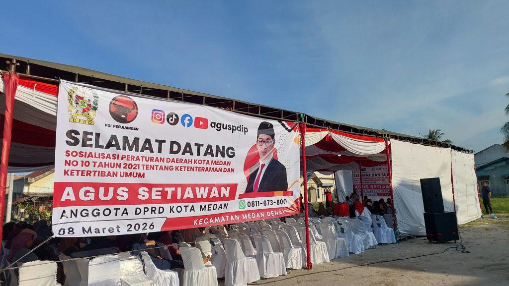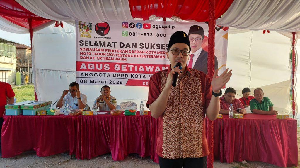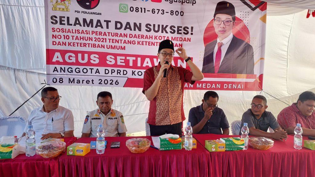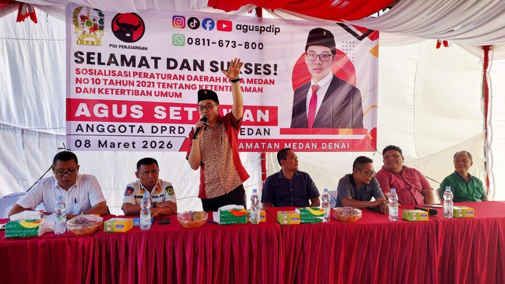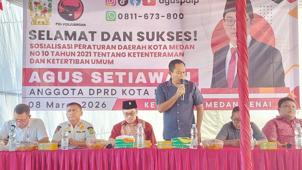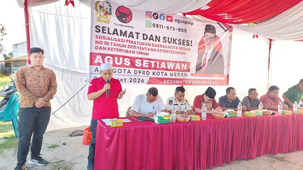 Ajakan itu disampaikan Agus Setiawan dihadapan ratusan masyarakat pada acara Sosialisasi Perda (Sosper) ke III Tahun 2026 produk hukum Pemko Medan Perda No 10 Tahun 2021 tentang ketentraman dan ketertiban umum di Jl Seksama Gg Ihklas, Kelurahan Denai, Kecamatan Medan Denai, Minggu (8/3/2026)