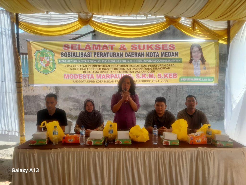 Selanjutnya Modesta Marpaung SKM S Keb menggelar Sosper ke III Tahun 2026 gelombang ke 2 produk hukum Pemko Medan Perda No 7 Tahun 2024 tentang Perubahan atas Perda No 6 Tahun 2015 tentang pengelolaan persampahan di Jl Bukit Barisan