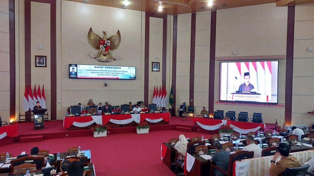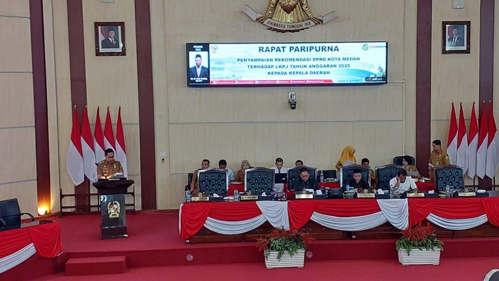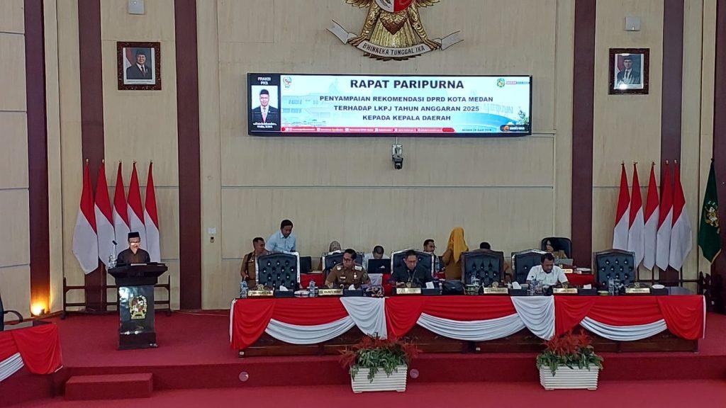 PosRoha.com | Medan, Dewan Perwakilan Rakyat Daerah (DPRD) Medan menggelar rapat Paripurna DPRD Kota Medan dalam rangka penyampaian rekomendasi hasil pembahasan Panitia Khusus (Pansus) Laporan Keterangan Pertanggungjawaban (LKPJ) Tahun Anggaran 2025 ke Walikota Medan, Selasa (28/04/2026).